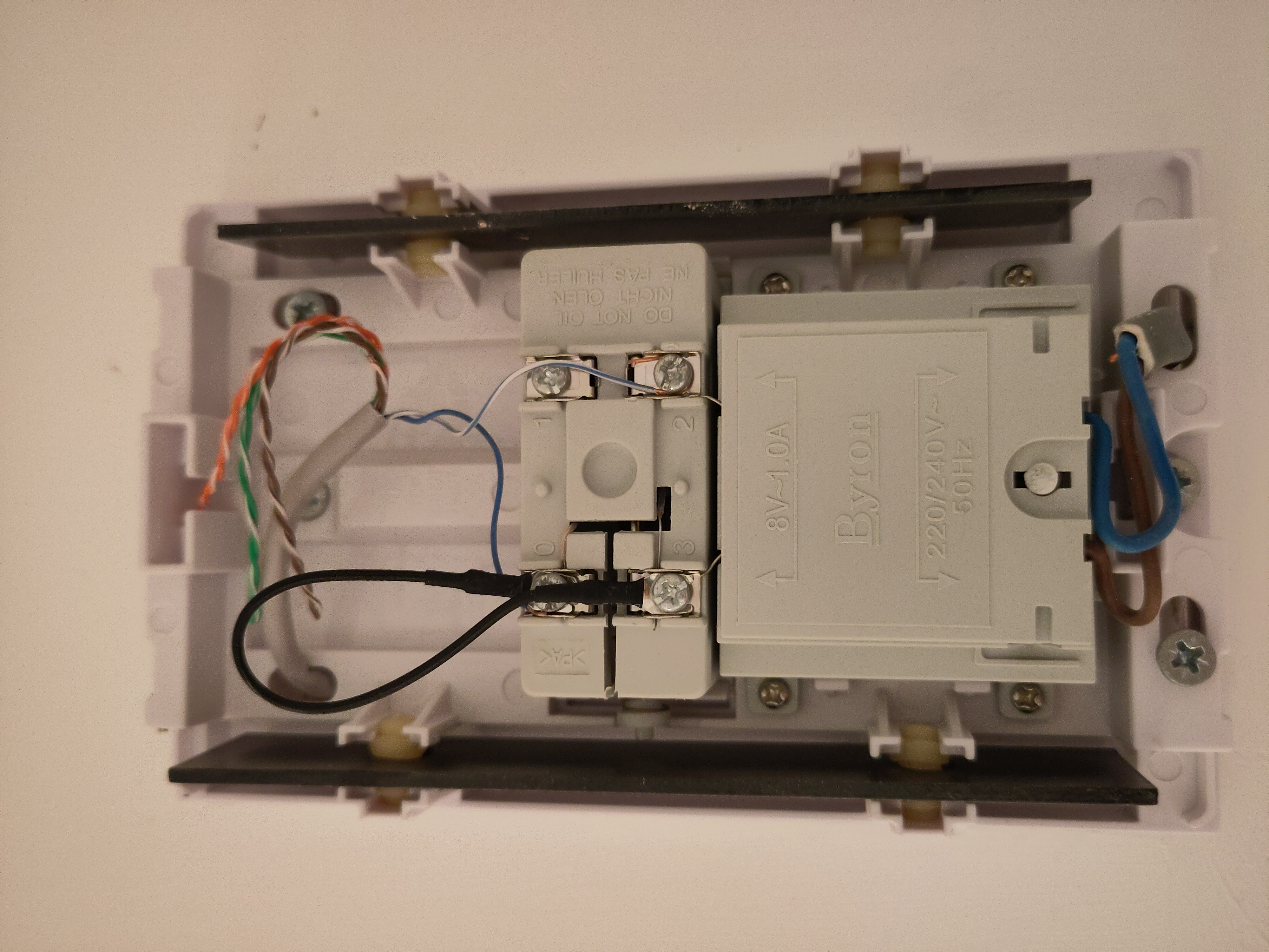 You might notice in the picture above, and I thought it was interesting and surprising, that my doorbell appears to be connected using an ethernet cable, just using one of the pairs and leaving the other three pairs tied off. I suppose if you have ethernet lying around already on a building site, it’s a convenient cable for running low voltage power when building a house.