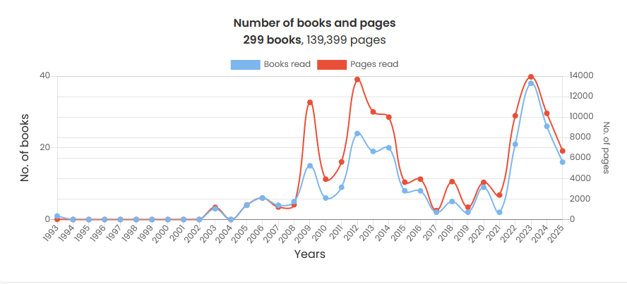 And I mentioned stats, right? Storygraph generates tons of stats about your reading. Here’s a graph of how many books and pages I’ve read: